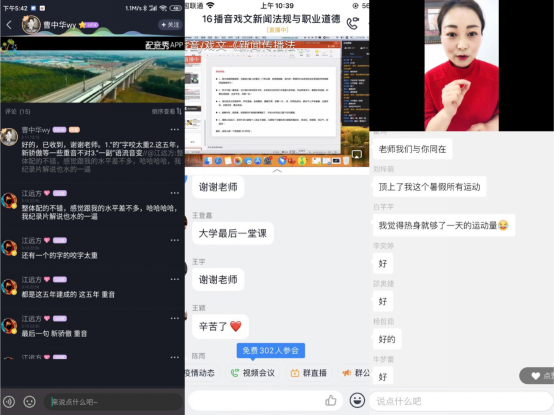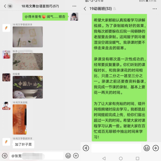 播音主持系江远方老师在准备《影视配音基础》时,专门将家里的一个卫生间粘贴声学环境材料改造成录音室,专门购置便携USB麦克风方便配音示范作品收声,并且充分寓教于乐,在配音秀APP的实践锻炼中带领学生感受配音的乐趣;广播电视系郑坤老师为302名大四学生讲授《新闻法规与职业道德》,用CCtalk直播连麦讨论的方式声情并茂,既讲专业理论也谈职业感悟,带给大家充满仪式感的大学最后一课;戏剧影视系田华老师在《形体与礼仪Ⅱ》《中外礼仪》等课堂上,采用“超星学习通直播—微信群互动—学习通练习作业”的方式,充分调动学生参与课堂的积极性;戏剧影视系罗妞老师在《影视表演基础》《舞台表演艺术》等课程的微信群课堂上,号召同学们从生活实际出发,真听真看真感受,用豆子、大米、花生等生活物品,创作艺术作品,为武汉加油,为中国加油,一堂又一堂的生命教育课,不仅提升了学生的专业实践能力,更帮助他们理解生命、尊敬生命、爱护生命;动画系赵永彬、栗劲草等老师,采用录屏PPT讲授的方式,提前一两天将录屏视频传入超星学习通,保证学生有充裕的时间观看学习,避免了因上课时段网络拥堵造成学习效率低下。
