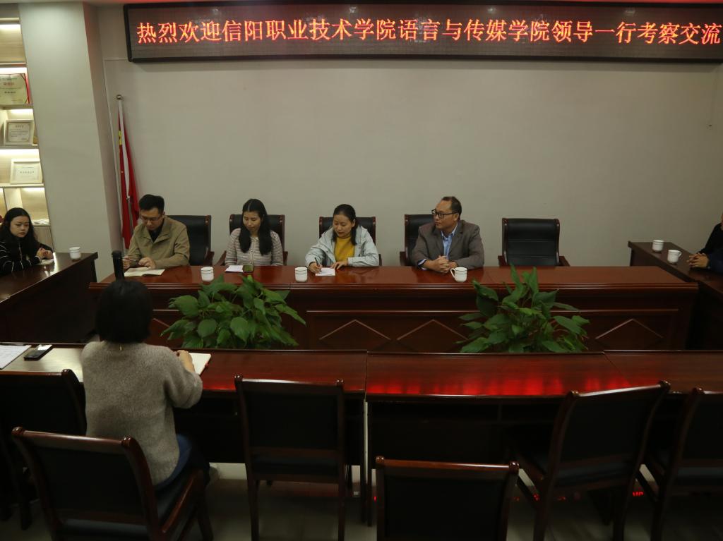 10月14日,信阳职业技术学院语言与best365网页版登录入口副院长梁维东、蒋吉优一行来365官网考察交流。吕东亮院长、田华副院长出席座谈会。