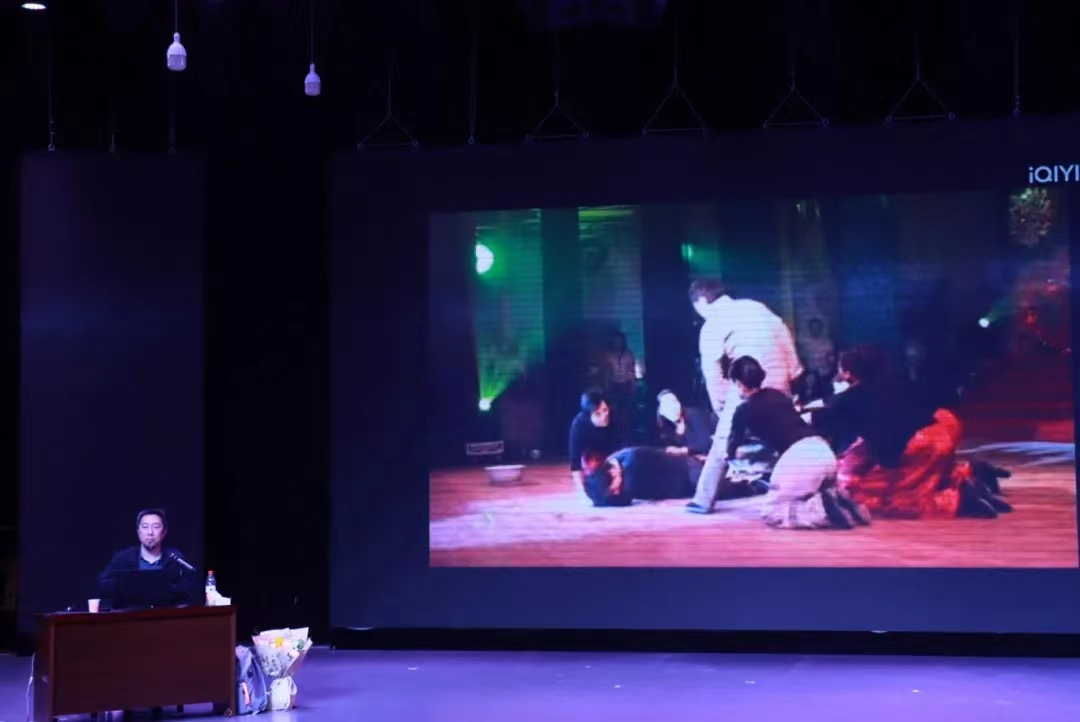 在讲学中,李玉昆教授结合自己的求学经历,讲到在艺术创作中,要充分挖掘本能创作,从生活逻辑出发,在创作构思环节进行多义性,有深度的思考。创作主题与创作内容两者密不可分,天赋和勤奋缺一不可,始终保持热爱是戏剧创作灵感不竭的源泉,也要多写多练,多看多思。他以自己的作品《心灵之音》为例讲到,大学生的戏剧创作可以先从改编开始,让自己先有成功的经验,不断积累形成具有自己的创作风格,更好融入到符合社会发展的戏剧创作领域中去。同时,他通过《成星》、《粉墨人生—戏班》等多部原创作品,以拉片的形式向与会师生讲述自己的创作过程和“情感回归”、“因人设戏”的戏剧创作方法。