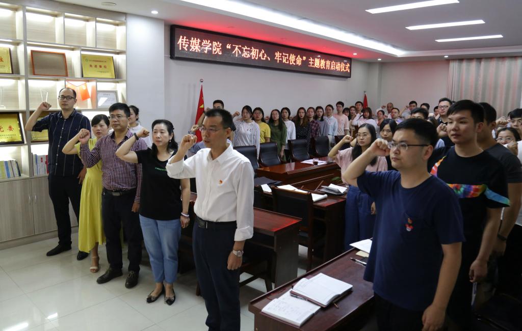 启动仪式在庄严的国歌中拉开序幕。随后,全体师生党员在王振海同志领誓下,面对鲜红的党旗,高举右拳,一起重温入党誓词。刘新建同志传达了《中共信阳师范学院委员会关于开展“不忘初心、牢记使命”主题教育的实施方案》。